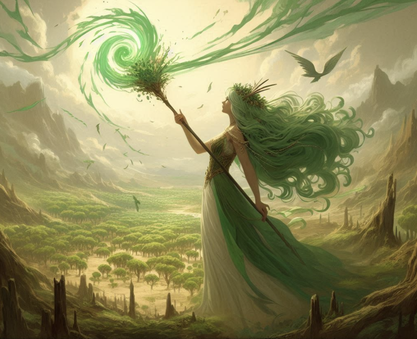 Doch die Landschaft war karg & leer, bis eines Tages die Göttin der Natur, Lunaria, vom Himmel herabstieg. Sie blickte auf das öde Land & beschloss, ihm Leben einzuhauchen. Mit einem Schwung ihres smaragdgrünen Stabes ließ sie einen riesigen Wald entstehen. Die Bäume wuchsen hoch in den Himmel, und Tiere fanden ein Zuhause. Doch Lunaria bemerkte bald, dass die Menschen begannen, den Wald zu roden, um Platz für ihre Felder zu schaffen.